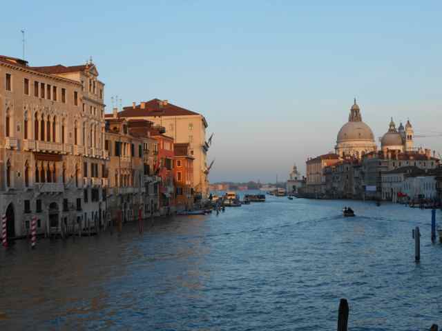 Grand Canal at sunset, with Santa Maria della Salute in the background.